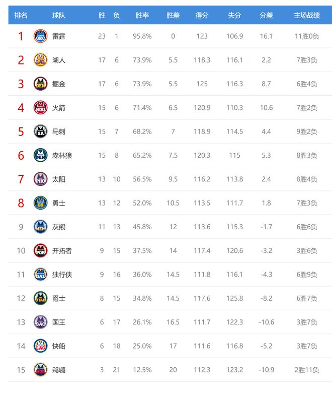 今日比赛后独行侠、爵士排名互换,其他西部球队排名不变。