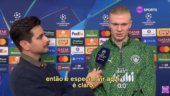 本赛季欧冠联赛阶段第6轮,曼城客场2-1战胜皇马。曼城前锋哈兰德赛后接受了TNT体育巴西频道的采访。