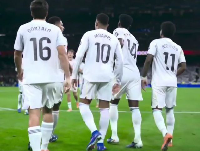 下半场,客队的马尔考早早被罚下,皇马多打1人,比赛基本失去悬念。第85分钟,罗德里戈禁区内突破被踢倒在地,皇马赢得点球机会,随后姆巴佩主罚破门,比分锁定为2-0。加上这个进球,姆巴佩今年打进59球,他也追平了C罗在皇马的年度进球纪录。