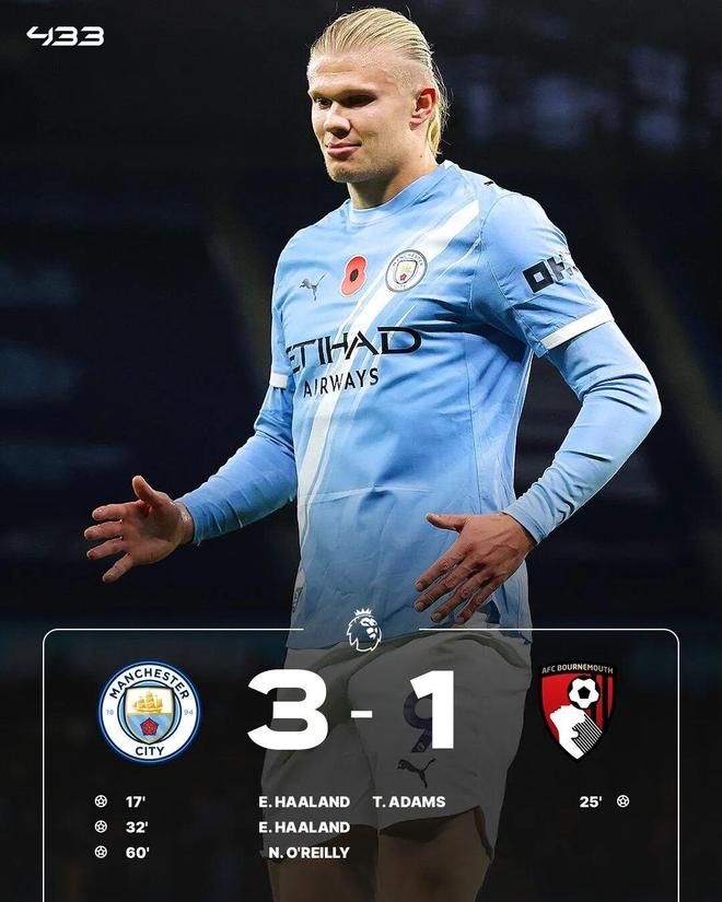 下半场,福登助攻,奥赖利突入禁区低射破门。最终,曼城3-1战胜伯恩茅斯。