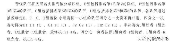 晋级队伍将按照名次排列被分成四组,E组包括排名第1和第2的队伍,F组包括排名第3和第4的队伍,G组包括排名第5和第6的队伍,H组包括排名第7和第8的队伍,各队伍通过抽签确定E、F、G、H组落位,小组赛同一小组的队伍四分之一决赛不再相遇。四分之一决