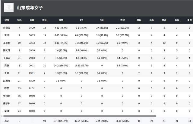 山东队4人得分上双,老将安静21投14中,独砍31分9篮板4助攻,王英竹17投8中,拿到19分12篮板,王泽19分4篮板4助攻,乔燕姿12分5篮板3助攻。