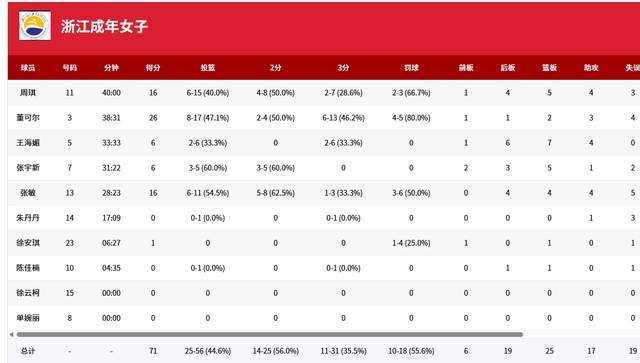 再看浙江队,没有万济圆和王佳琦,实力下降不少,全队3人得分上双,董可尔空砍26分3助攻,周琪16分5篮板4助攻,张敏16分4篮板4助攻。