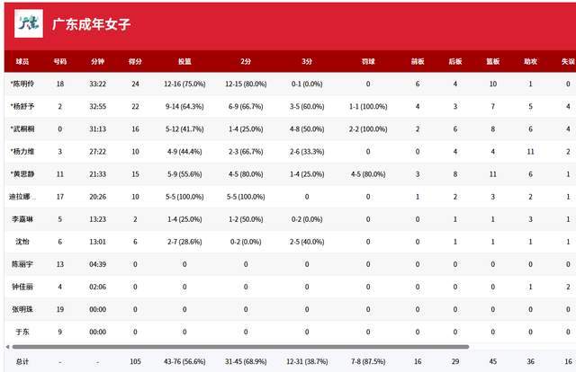 广东队多达6人得分上双,陈明伶24分10篮板,杨舒予22分7篮板5助攻,杨力维10分4篮板11助攻,武桐桐16分8篮板6助攻,黄思静15分11篮板6助攻,迪拉娜10分3篮板。