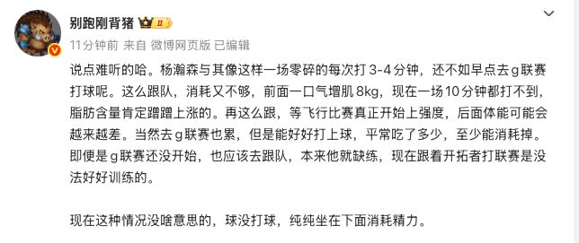 说点难听的哈。杨瀚森与其像这样一场零碎的每次打3-4分钟,还不如早点去g联赛打球呢。这么跟队,消耗又不够,前面一口气增肌8kg,现在一场10分钟都打不到,脂肪含量肯定蹭蹭上涨的。再这么跟,等飞行比赛真正开始上强度,后面体能可能会越来越差。当然去g联赛也累,但是能好好打上球,平常吃了多少,至少能消耗掉。即便是g联赛还没开始,也应该去跟队,本来他就缺练,现在跟着开拓者打联赛是没法好好训练的。
