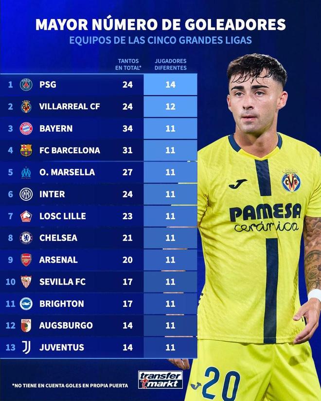 北京时间11月13日,德转统计出了本赛季至今欧洲五大联赛进球球员人数最多的13支球队,巴黎圣日耳曼14名球员在法甲破门排名第一,比利亚雷亚尔12人西甲破门第二,包括拜仁慕尼黑、巴塞罗那、国际米兰、切尔西、阿森纳以及尤文图斯在内的11支球队均有11名球员在联赛中破门并列第三。