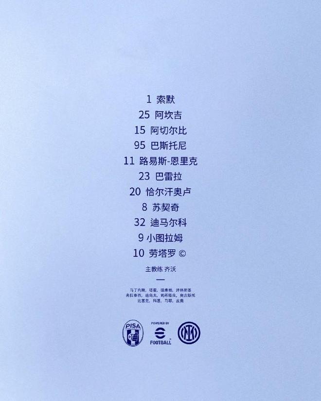 国际米兰首发:1-索默、25-阿坎吉、15-阿切尔比、95-巴斯托尼、11-路易斯-恩里克、23-巴雷拉、20-恰尔汗奥卢、8-苏契奇、32-迪马尔科、9-图拉姆、10-劳塔罗